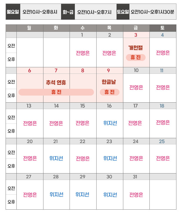 | 토요일 | 오전10시 ~ 오후1시30분 |