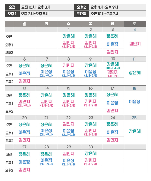 | 토요일 | 오전10시 ~ 오후7시 |