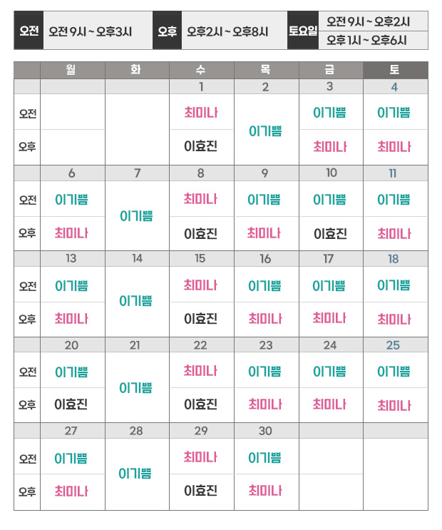 | 토요일 | 오전9시 ~ 오후6시 |